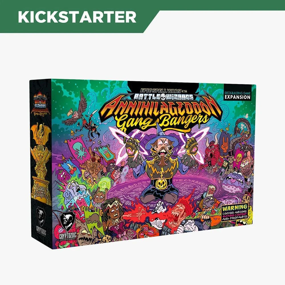 Epic Spell Wars of the Battle Wizards: ANNIHILAGEDDON — Gang Bangers is a Kickstarter exclusive expansion. It requires either the first or second ANNIHILAGEDDON game, and gives players an entirely new way to play. Players get Gangs, each of which is unique and features different Gangsters that can be recruited to help defeat enemies. The expansion also replaces the Legend boss stack with Legend – Treasures, a pile of powerful cards that ramp up the damage.