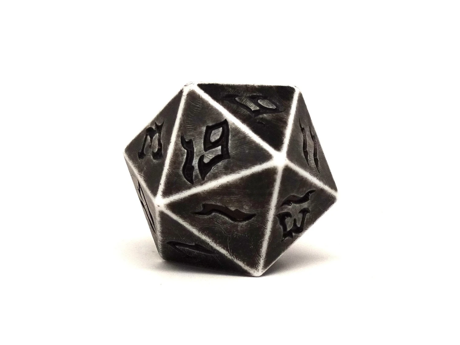 This enormous 48mm plastic dice is truly giant. This variety is our Stone Giant D20. The color scheme has a blend of black and grey with black numbering.