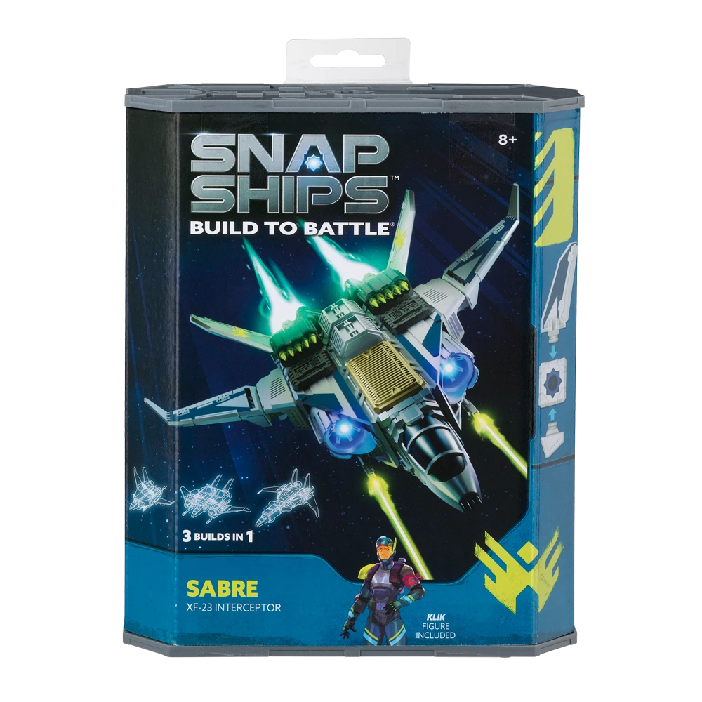 The Snap Ships set for Sabre includes instruction for three different builds that you assemble yourself and then engage in battle with real shooting weapon play! Sabre XF-23 Interceptor is impressively armed and agile, and it’s the main fighting ship against the Komplex. Klik, the newest member of the Forge, is the talented pilot who will take this ship on strike missions. With the mysterious UJU tech piece that’s included, Sabre will be even more impressive in the fight against the Komplex!